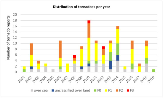 Distribution of 142 tornadoes per year (1 January 2001–1 January 2020). Includes 106 events with classified intensity (Fujita scale), 8 unclassified events over land, and 28 events over the sea.