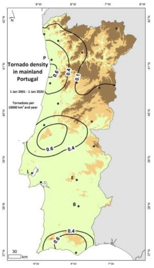 Tornado density was computed for each point by dividing the number of events within a 50 km radius, by the corresponding surface area. Figure 6 shows the spatial distribution of events per 10,000 km2 and per year, estimated considering 114 reports of tornado over land (an area of 89,015 km2), for the period between 1 January 2006 and 1 January 2020. The map revealed that there are more than 0.6 tornadoes per 10,000 km2 and per year in the areas with higher tornado activity. The region in the center of the map is known as the Portuguese “tornado alley”, and corresponds to the southern part of a mountain range that extends north of Lisbon, to the northeast. Observations suggest that this mountain range may play a role in the activation of tornadic storms. A smaller region, at the northern part of the west coastal area, around Porto (second largest urban area in Portugal) also received more than 0.6 tornadoes per 10,000 km2 and per year. The southern coastal area, also densely populated, ranked second in the national tornado average. The northeast mountainous area of the country, revealing less than 0.1 tornadoes per 10,000 km2 and per year, showed the lowest tornado activity. Underreporting seems likely in the southern region of Alentejo (main towns Évora and Beja), given its lowest population density, and because the landscape is characterized by large grassland areas with scattered trees, where tornado damages are hard to trace.
