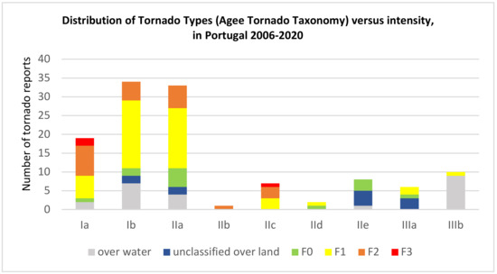 Distribution of TT (Tornado Types) versus intensity in Portugal (1 January 2006–1 January 2020) following the tornado taxonomy [15] includes 86 events with classified intensity (Fujita scale) and 34 unclassified events (both over water and over land).