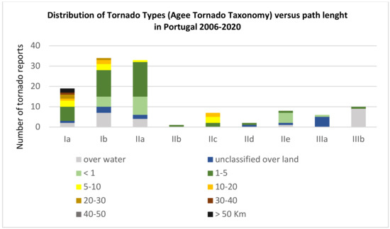 Distribution of TT versus path length in Portugal (1 January 2006–1 January 2020) following the tornado taxonomy [15] includes 86 events with classified intensity (Fujita scale) and 34 unclassified events (both over water and over land).