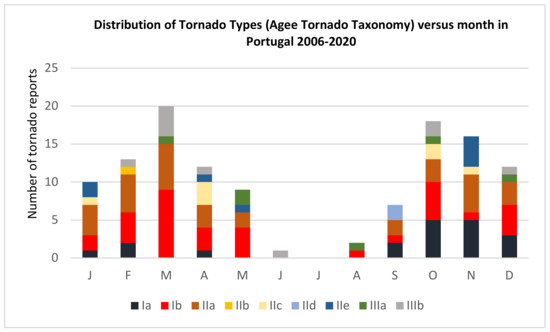 Distribution of TT versus month in Portugal (1 January 2006–1 January 2020) following the tornado taxonomy [15] includes 86 events with classified intensity (Fujita scale) and 34 unclassified events (both over water and over land).
