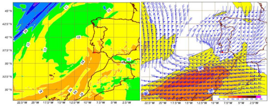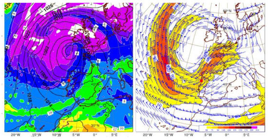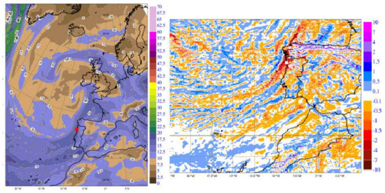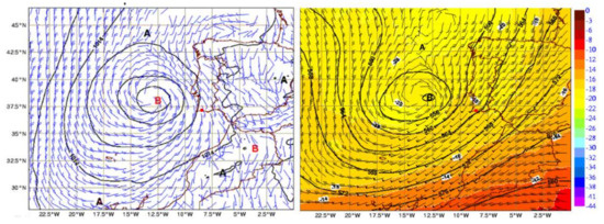 On 16 November 2012, at 12 UTC, the ECMWF mean sea level pressure short term forecast (H+12) showed an extra-tropical low, centered to the west of Lisbon (Figure 10, left), extending up to the high levels of the troposphere (Figure 10, right). An instability line developed from a warm and moist airmass of 14–16 °C pseudo wet-bulb potential temperature (Figure 11, left), was being advected in a strong south-southeasterly flow over southwestern Iberia. An upper-level jet streak was located to the south of the low core (Figure 11, right), thus acting as a source of lift over southern Portugal. The region was under its left exit area. Furthermore, the jet with northeasterly winds of more than 90 kt at 300 hPa (Figure 11, right), was sustaining a strong deep-layer shear over southern Portugal.