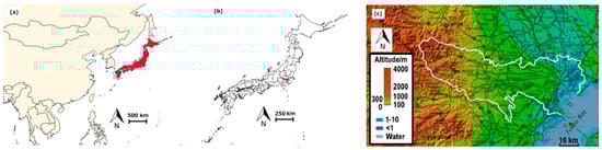 (a) Japan’s position in East Asia. (b) Tokyo’s position in Japan. Source: National Land Numerical Information (https://nlftp.mlit.go.jp/ []) (c) Topography of the Tokyo region discussed in this paper, with a white line denoting the boundary of the Tokyo Area.