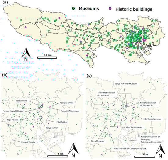 Location of (a) Historic buildings (pink) and museums (green) in Tokyo, (b) major historic buildings and (c) museums in central Tokyo. Note: Source: National Land Numerical Information (https://nlftp.mlit.go.jp/ []).