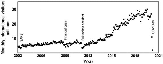 Pressures on our heritage are much discussed, and the impact of external local and global events is clear from Figure 3, where the numbers of foreign visitors to Japan are plotted. Pressures from epidemics, financial collapse and geophysical events cause fluctuating visitor numbers. The most recent crisis of COVID-19 has had a special impact on the heritage sector, where it has greatly affected visitor numbers and the attendant loss of income, though in some cases the most fragile sites experienced a welcome respite from heavy flows, allowing natural sites to recover a little []. There will also be problems with the subsequent cleaning of the viral contamination from properties and interior surfaces.
