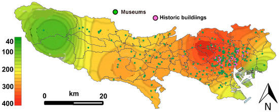 Tokyo, as a major city with a lengthy history, has a great wealth of heritage. There are numerous historic buildings and sites shrines, temples and great buildings, perhaps some favourites being: (i) Asakusa Shrine, (ii) Tōgū Palace, (iii) Tokyo Station, (iv) Sensō-ji Niten-mon, (v) Nezu Shrine, (vi) Enyuu-ji Temple, (vii) Former Iwasaki House, (viii) Eitai Bridge, (ix) Shofuku-ji Temple Jizōdō. Add to this many historic buildings; these marked as 83 points in pink (Figure 2a,b) and all of them are designated buildings and structures as National Treasure or Important Cultural Properties. Tokyo has hundreds of museums and galleries, some of the favourites being: (i) Tokyo National Museum, (ii) Edo-Tokyo Museum, (iii) Ghibli Museum, (iv) Nezu Museum, (v) Hara Museum of Contemporary Art, (vi) Mori Art Museum, (vii) Tokyo Metropolitan Art Museum, (viii) National Museum of Western Art, and (ix) the National Museum of Emerging Science and Innovation. Museums are marked as 232 points in green (Figure 2a,c). Maps of heritage and the risk imposed by climate change are often seen as important tools for the strategic management of heritage, e.g., [,], with some at a national or regional level [,,,]. Among a few examples of Japanese studies in this field, [,] integrated a database of the nationally designated cultural properties and a map of the active faults with GIS to estimate the seismic risk of each property. Difficulties in such mapping involve the problem of scaling because data are typically collected at national or regional levels rather than at city scale. It is also problematic to tune the data, often collected for other purposes, to heritage; e.g., seismic risk is defined for buildings in general, not heritage, or that meteorological information is collected for many purposes, so the risks imposed on heritage requires considering the notion of heritage climate [,].