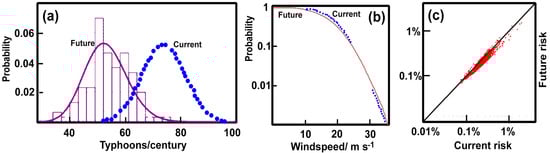 (a) Probable number of typhoons in Tokyo in 100 years from the stochastic typhoon model. Dotted and solid lines indicate present and future projections, respectively; see also []. (b) Exceedance probabilities for annual maximum wind speeds in Tokyo under current and projected climate. (c) Percentage wing risk for residential buildings in Japan under current and future scenarios [].