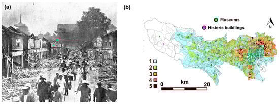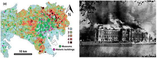 Figure 7b maps the potential risk to buildings from earthquakes []. Although it is not tuned to heritage related structures, these sites are marked on the combined risk map of Tokyo. This combination brings together the risk of building collapse with the risk of fire. Older buildings tend to be found in the historic downtown of Tokyo. Those along the Arakawa and Sumidagawa rivers offer lower earthquake resistance, as the structures typically have wooden or light-gauge steel frames. Machiya, Arakawa-ku is one of the worst affected areas in Tokyo, a district of densely packed wooden houses and narrow alleys, with little access for fire trucks. High risk areas are thus characterised by tightly packed buildings. Additionally, shaking can be amplified by ground characteristics, and valley and alluvial lowlands may lead to a higher risk. Fire risk is often enhanced in residential areas because of the wide use of open-flame appliances, and high density adds to the risk of fire spreading as these communities have fewer open spaces, such as parks and wide roads, which might act as fire breaks. Overall, such conditions are typical of historic areas where there is likely to be a high concentration of close-set older wooden structures (as mapped for central Tokyo in Figure 8a), with low resistance to fire []. Thus, the vulnerability of built heritage is not surprising, because it is most frequently associated with the older historic districts. Tokyo has been subjected to many fires. The most notable one is the Great Fire of Meireki, which occurred in 1657. It is rumoured that the fire was started when a cursed kimono was set on fire on a very windy day []. The fire spread quickly through the city, because of strong winds from the northwest, which illustrates the role of climate conditions in large scale fires. The conflagration that followed the Great Kantō Earthquake destroyed neighbourhoods and some significant sites, such as the Metropolitan Police Department building (Figure 8b). Such characteristics of central Tokyo contributed to the enormous loss of historic buildings and residences from fires after incendiary bomb raids during World War II.