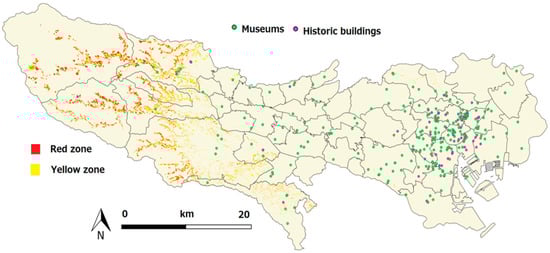 Sediment disaster map of the Tokyo area. Red Zone where slopes can collapse and damage buildings and threaten lives. Yellow Zone where steep slopes can collapse, risking injury or life. Source: National Land Numerical Information (https://nlftp.mlit.go.jp/ []).