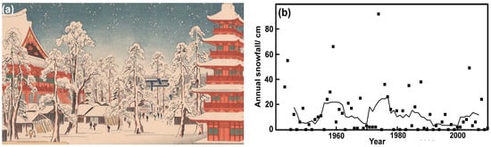 (a) Hiroshige’s Snow Scene at Kinryuzan Buddist Temple, Asakusa District (b) Annual Tokyo snowfall. The line shows the 7-year running mean. Note: Image is part of Toto Yukimi Hakkei (8 Snow Scenes of the Eastern Metropolis): http://mercury.lcs.mit.edu/~jnc/prints/8snow.html []. Data from WMO Station ID:47662 of JMA.