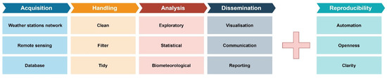 The following graph (Figure 1) is the classic or typical research workflow having 4+1 steps. The first step, as anticipated, is the data acquisition, followed by the data handling step. Then there is the analysis of the prepared data with the biometeorological methods. Finally, there is the step of results dissemination.