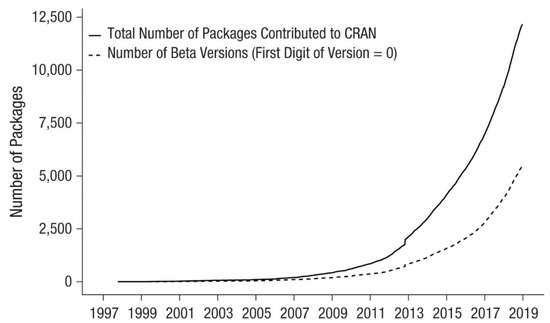 The number of R packages contributed to the Comprehensive R Archive Network (CRAN) [58].