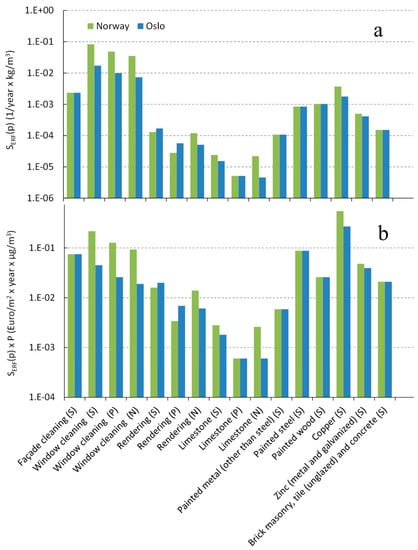 (a) Slopes of the ERFs (SERF,p,i, 1/year × kg/m3), and (b) the marginal cost of the maintenance of the façade materials (SERF,p,i × P, Euro/m2 × year × µg/m3) for the air pollutants SO2 (S), PM10 (P), and NO2 (N), in Norway and Oslo.