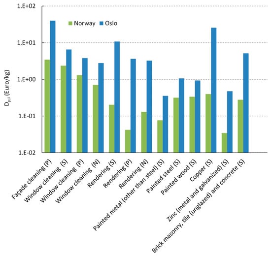 Figure 2 shows the estimated marginal damage cost per kilo emission for each material and maintenance effort. Due to the proximity of the façades in Oslo to ground level emission sources, much higher costs were estimated in Oslo than in Norway. This is especially so for rendering and copper, for which the fraction of the total façades in Oslo was assessed to be significantly higher than in Norway (Table 4). Conversely, the fraction of painted façade materials, including wood, was assessed to be considerably higher for Norway than for Oslo. Therefore, the difference in the cost estimates between Norway and Oslo is less for these materials.