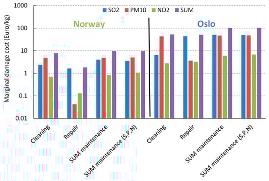 Marginal maintenance costs of 0.2–0.5 Euro per kg emitted SO2 in towns and villages with more than 15000 people, and 18 Euro per kg in Oslo (0.5–22 Euro per kg in the major cities) were reported for Norway in the 1990s, recalculated here to 2020 values by applying an increase in the unit labour costs in Norway from 2004 (the reporting was in 2004 values) to 2020 of 67% [25]. The damage costs due to the soiling of buildings in Sweden due to the exposure to total emitted PM10 were reported, in 2017, to be in the range between 1.4 and 4.3 Euro per kg in villages and small towns and about 62 Euro per kilo in a large town such as Stockholm (when assuming 1 Euro = 10 SEK) [12] (p. 91). These values for Norway are lower than, and the values for Sweden comparable with, the values found in this work, of: 1.6 Euro per kilo SO2 and 4.8 Euro per kilo PM10 for the regional Norwegian scenario, and 44 Euro per kilo SO2 or PM10 in Oslo (Table 6), and with the values for damage cost to health reported by [12] (see Introduction).