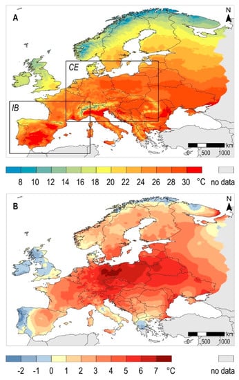 Monthly maximum air temperature in Europe, in June 2019. (A) Average; (B) Anomaly with respect to the period 1981–2010. CE, Central Europe domain and IB, Iberia and the Western Mediterranean domain.