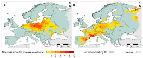 Magnitude of the exceedance of the previous record of (A) the average monthly maximum air temperature, in June 2019, and (B) the maximum daily air temperature, in June 2019, with respect to the period 1950–2018.