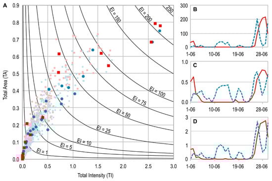 The following section of the paper contains an evaluation of June 2019 in terms of occurrence of hot days (HDs) using the extremity index (EI), with a particular focus on the CE and IB spatial domains. A total of 29 HDs occurred in the CE domain, which means that some part of the domain was affected by extreme temperatures every single day of the month, except one. There were 25 HDs in the IB domain. Figure 3A presents the total area (TA) and total intensity (TI) along with the corresponding EI values for individual HDs in June 2019 (large symbols) and in the period 1950–2018 (small symbols). The EI values increase rapidly along with a simultaneous increase in the TA and TI of an HD. The highest values, exceeding EI = 100, correspond to very severe HDs, associated with very large TA and TI. However, in cases when only one of the EI components (TA or TI) is exceptionally high, and the other component has a relatively small value, the EI values are much lower (Figure 3A).