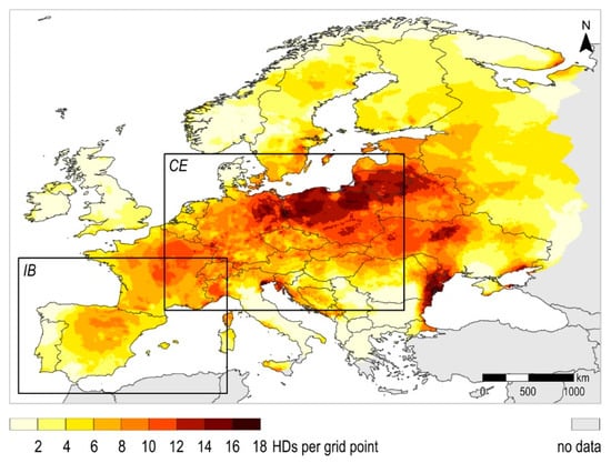 Extreme heat events are most often defined as days or sequences of days (heatwaves) with air temperature exceeding a threshold determined based on the probability distribution of air temperature at a given place []. Most research on temperature extremes has been focused on the analysis of time series at isolated points [], but in the most recent studies, attention has been paid more frequently to their spatial range, which together with their intensity and duration, affects the outcome of these extremes [,,,]. Severe heat events contribute to an increase in morbidity and mortality, and as research confirms, early-season heat events are even more hazardous than these occurring later in the season [,]. Extremely hot weather also causes losses in regional economies and natural ecosystems. Frequently, the losses are sharply exacerbated by droughts and fires associated with heat events [].