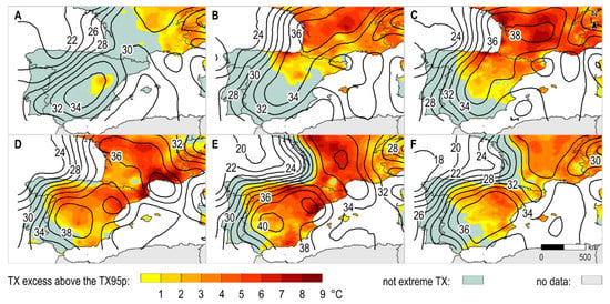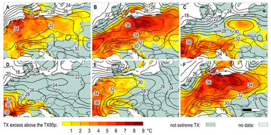 (A–F) Excess of daily maximum temperature above the 95th percentile threshold noted in the Central Europe domain on subsequent days from 25 to 30 June 2019. Isolines show daily maximum temperature values.