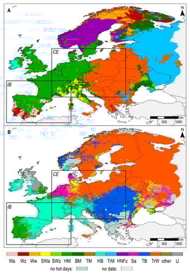Typically, weather in Europe, in June, is under the influence of variable GWT advection types, with those associated with advection of air masses from the west and north playing the most important role (Table 5). June 2019 was quite unusual in terms of atmospheric circulation conditions, as weather types with advection of air masses from the south largely predominated; the south and southwest GWT advection types persisted for almost 75% of the days (Table 5). June 2019 was also not “normal” in terms of circulation types associated with HDs. Although HDs occurred during TrW over a significant part of Europe, a significant role was played by other, less common circulation types (Figure 7B and Figure 10). The low over British Islands (TB) circulation type played a significant role in the southeastern part of CE. The HB type, which favors advection from the south, prompted the occurrence of HDs in the southwestern part of CE and over most of IB. Hot days, in the western part of CE, were associated with the rarely occurring anticyclonic southerly (Sa) circulation type, in June (1% of days in the period 1950–2018) (Figure 7B and Figure 10). Hot days characterized by the highest EI in June 2019 were associated with the aforementioned circulation types, i.e., HB and Sa types in CE, and the HM and HB types in IB. It was only on the 30th of June that a very severe HD was accompanied by the Wa circulation type, associated with an extensive high-pressure system with a center located over the Atlantic, to the north of Iberia (for model maps of particular circulation types see []).