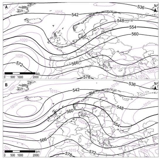 Composite pattern of sea level pressure (SLP) and 500 hPa geopotential height typical for the Groswetterlagen circulation types. (A) Through over Western Europe (TrW); (B) High over Central Europe (HM). SLP is shown in violet (light grey) and isobars use 2.5 hPa intervals. Geopotential height is shown in black and contours use 6 dam (decameters) intervals.