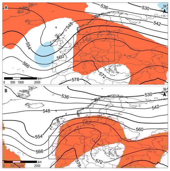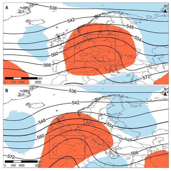 Composite pattern of 500 hPa geopotential height typical for the hot days with EI > 1 occurring, in June, in 1979–2018 in (A) Central Europe and (B) Iberia and the Western Mediterranean. Contours use 6 dam (decameters) intervals. Shading indicates areas passing 1% significance test. Red (dark) shading denotes positive significant anomalies (unusually high heights) and blue (light) shading denotes significantly low heights. A rectangle marks the boundaries of the respective domain.