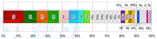 The role of atmospheric circulation in the occurrence of HDs was evaluated using two separate methods. To properly evaluate the atmospheric conditions accompanying HDs in both domains, very local events (EI < 1) were not considered in these analyses. First, the subjective Grosswetterlagen (GWL) circulation types catalog was used [,]. The GWL circulation types were determined based on the location of key pressure systems, the direction of air mass advection, and type of rotation over Central Europe, i.e., cyclonic or anticyclonic (see [] or [] for typical maps of all individual types). A total of 29 circulation types were categorized into three circulation groups (zonal, meridional, and mixed), and an unclassified type [] (Table 1). Additionally, the GWL circulation types were grouped into eight Grosswettertypen (GWT) types regarding the airflow direction (Table 1) []. Originally developed for Central Europe (i.e., Germany), the GWL concept is applicable over a substantially wider area, extending to all of Europe [,]. The GWL catalog has already been successfully used in studies concerning relationships between atmospheric circulation and extreme temperature events [,,].
