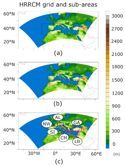 Regional climate models (RCM) domain with: the NEMO ocean model domain (panel (a), thin black rectangle); sub-regions used for computing temperature and precipitation trends (North Mediterranean and Southern Mediterranean, blue and red rectangles, respectively, panel (b)), the six boxes for computing the precipitation probability(panel (c)): Alps region (AL, blue rectangle); North-West Mediterranean coast (NW, orange rectangle); South Italy and Central Mediterranean Sea (SI and CM, red rectangle); Greece and Anatolian Peninsula (GA, brown rectangle); Levantine Basin (LB, magenta rectangle).
