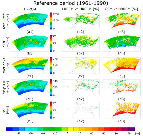 Figure 2 (panels d1–d3) shows the annual total precipitation during intense events (R95pTOT) and how it differs (in percent %) among the three simulations, in the reference period. The largest values occur over the northern areas of Europe and, over the mountain reliefs, where maxima reach 760, 474, 450 mm/year for HRRCM, LRRCM and GCM, respectively. Values decrease southwards.