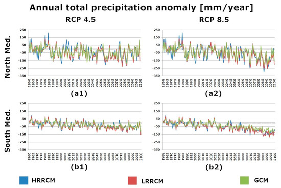 Time series of annual cumulative precipitation anomaly (mm/year) for the period 1960–2100, for RCP4.5 (panels (a1,b1)) and RCP8.5 (panels (a2,b2)) scenarios, for the three considered horizontal grid resolutions (HRRCM, LRRCM and GCM) distinguished by blue, red and green colors. Values represent spatially averages over the two analyzed sub-areas (North and South Mediterranean) and are anomalies with respect to the 1961–1990 mean). (a1,a2), North Med. sub-area; (b1,b2), South Med. Sub-area.