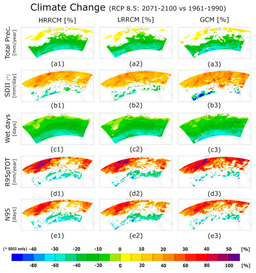 Change (percent, %) of the indexes defined in Section 2.2 in the RCP8.5 scenario simulation. All panels show the difference between the 1961–1990 and 2071–2100 periods according the HRRCM (first column), the LRRCM (second column), the GCM (third column). White areas denote points where differences are not statistically significant. Positive values denote higher index values in the future (2071–2100) period. Along the color bar, upper labels refer to SDII, the bottom ones refer to all the other indexes (a1–a3), annual total precipitation; (b1–b3), SDII index; (c1–c3), annual number of wet days; (d1–d3),), annual total precipitation amount when daily precipitation is greater than 95th percentile; (e1–e3), number of days when RR ≥ RRwn95.