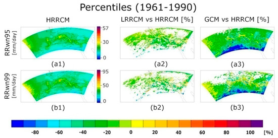 Figure 5 shows the 95th (RRwn95, panel a1) and 99th (RRwn99, panel b1) percentile of precipitation in wet days for the high-resolution model (0.11 × 0.11 degs) during the reference period. Columns two and three show differences of the HRRCM with respect to the LRRCM and the GCM, respectively. Only statistically significant differences are plotted.