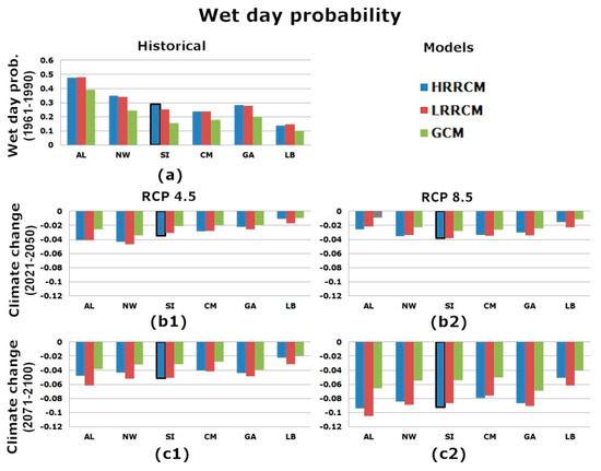 The probability of wet days decreases with the intensity of the considered emission scenarios and with time, being smallest for the RCP4.5 and the 2021–2050 period and largest for the RCP8.5 and the 2071–2100 period. The decrease is statistically significant in all considered cases, except for the GCM case, over AL, in the period 2021–2050 of the RCP8.5 scenario. The value of the decrease of wet day probability is not significantly different between HRRCM and LRRCM, except for SI, where HRRCM systematically presents the largest decrease in all scenario and time periods.