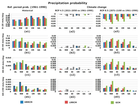 Probability of daily precipitation (from 0 to 1) as function of intensity range and its variation with climate change. All values are computed under the condition of day being a wet day. Four ranges of intensity are considered in the different rows: weak (0–20 mm/day), medium (20–40 mm/day), strong (40–60 mm/day) and intense (above 60 mm/day). Panels (a1–d1) (first column) show the probability of rain for the reference period (1961–1990). (a2–d2) Second and (a3–d3) third columns show the probability change for the RCP4.5 (near-term, 2021–2050) and RCP8.5 (long-term 2071–2100) scenarios with respect to the reference period (1961–1990). Grey bars denote differences that are not statistically significant. A bold border of blue bars denotes differences between HRRCM and LRRCM that are statistically significant.
