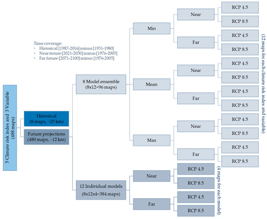 Being aware that each individual GCM/RCM model has its own uncertainties, we kept the entire ensemble and considered all members and their statistics, in particular calculating the minimum, mean, and maximum values of the model ensemble, creating a further 96 maps (Figure 1) [20,21].