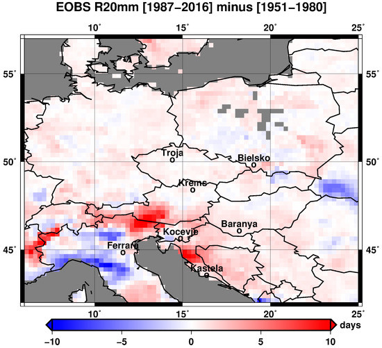 Figure 2 shows the changes of the R20mm index in the past between the 30 year periods 1987–2016 and 1951–1980 by using the E-OBS observational dataset. The map shows that the major changes occur on the Croatian coast of the Adriatic Sea; in the mountain areas at the borders between Italy with Austria and France, with the maximum increase observed >10 days (red); and in Northern Italy, reaching values no greater than 10 days (blue).