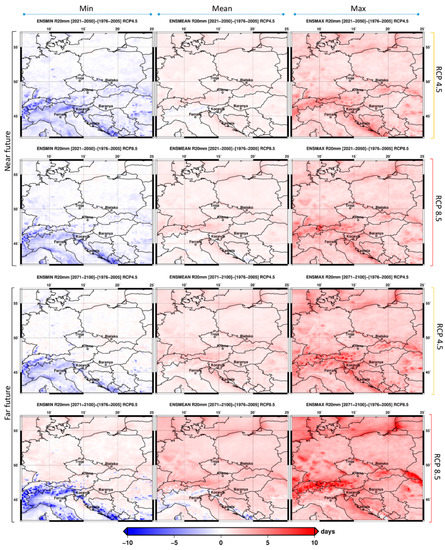 This figure shows a complete set of climatic projection simulations related to the model ensemble statistics of the R20mm climate extreme index. Minimum, mean, and maximum variations under RCP 4.5 and 8.5 for the near future (2021–2050) and far future (2070–2100) are reported (spatial resolution = 12 × 12 km).