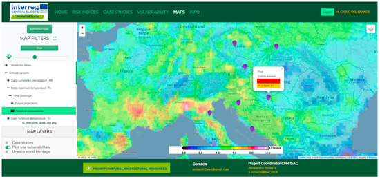 The website of the “ProteCHt2save Web GIS Tool for Risk Mapping” [28], which we developed, is composed of 6 pages, including explanations on the utilized climate models, climate extreme indices, and variables; and illustrations cards for the pilot sites with major information on the features of the monuments and historic buildings taken into consideration, their state of conservation, past disasters that occurred in the area, and measures undertaken for protection (Figure 4). A special focus on the methodology followed to determine the criticalities and rank the vulnerability of each site is also given and a section is completely dedicated to the map creation. Maps related to historical observations and climate projections can be produced by selecting all combinations of individual models and ensemble statistics described in the present contribution. The location of the ProteCHt2save pilot sites can be visualized in addition to the distribution of the UNESCO World Heritage Sites in Central Europe, thanks to the collaboration with the Project Joint Programming Initiatives on Cultural Heritage—Protection of European Cultural Heritage from Geo-hazards (JPI-CH-PROTHEGO) (2015–2018). The tool is accessible at https://www.protecht2save-wgt.eu/.