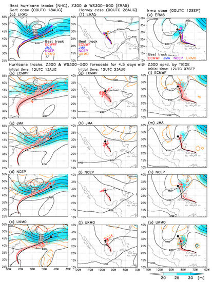 Figure 2 shows predicted ensemble mean upper-level wind speed (averaged between 300- and 500-hPa levels) and geopotential heights at 300 hPa (Z300) over a period of 4.5 days, tracks of Gert (a trough case), Harvey (a no trough case), and Irma (a trough case), and Z300 ensemble spreads in all four operational medium-range ensemble forecasts (ECMWF, JMA, NCEP, and UKMO).