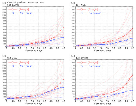 Analyses of hurricanes in 2017 in Section 3.1 show that errors in track forecasts are related to the existence of upper-level troughs. To compare the skill of the models from the four operational centers to forecast Atlantic hurricanes with and without troughs, we plotted the average central position errors of hurricanes between 2007 and 2019 in Figure 3. The difference between forecast and best track central position (central position error) increases with lead time in all operational models. However, the difference between error in trough cases and that in no trough cases is only obvious in the latter half of forecast periods. In the ECMWF and JMA models, this difference remains small (<100 km) between forecast days 0 and 3.5 (Figure 3a,b), increases rapidly after forecast day 4.0, and reaches about 300 km at forecast day 4.5. In contrast, in the NCEP and UKMO models, the difference between central position error in trough cases and that in no trough cases exceeds 100 km after forecast day 2.5 (Figure 3c,d), increases rapidly after forecast day 4.0, and exceeds 300 km at forecast day 4.5 in ECMWF and JMA. Central position errors in all cases are relatively small in all models up to forecast day 2, which indicates the limit for atmospheric stochastic variability (Figure 2). These results indicate that all the operational forecast models have relatively large error and ensemble spread in upper-level troughs, resulting in large error and ensemble spread of hurricane track forecasts after 4.0 forecast days.