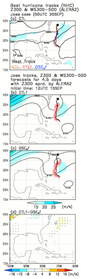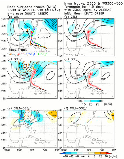 Large errors in predicted upper-level wind speed over the east coast of US cause the predicted tracks of Irma to displace further eastward (Figure 4b,c). The difference between CTLf and OSEMf in upper-level wind speed is negative and that in Z300 is positive over North America and the east coast of the US (Figure 4e). The difference between CTLf and OSEMf is negative in Z300 ensemble spread (orange contour in Figure 4e) because ensemble spread of the predicted central position is larger in OSEMf than in CTLf.
