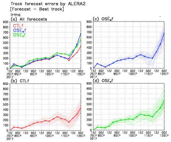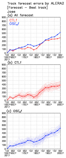 Central position errors in CTLf increases with lead time, growing to about 450 km at forecast day 4.5 (Figure 5a,b). Northwestward movement of Irma is reduced because predicted wind speed around the upper-level trough is lower than observed wind speed in CTL (Figure 4a,b). Forecast error of the track of Irma in CTLf is larger than that in operational numerical weather predictions because of differences in model performance (e.g., resolution and physical parameterizations) and assimilation methods (e.g., assimilation techniques and quantity of assimilated data) in CTLf (Figure 3k and Figure 4a). The forecast using OSEM (OSEMf) predicts northward movement of Irma on 10 September (Figure 4c). However, all members of the OSEMf move northeastwards on 11 September, and move further eastward than those in CTLf. Between forecast days 0 and 3.5, there is no difference between the central position error in CTLf and that in OSEMf; after forecast day 4.0, error and ensemble spread of predicted central position in OSEMf are larger than those in CTLf (Figure 5a–c).