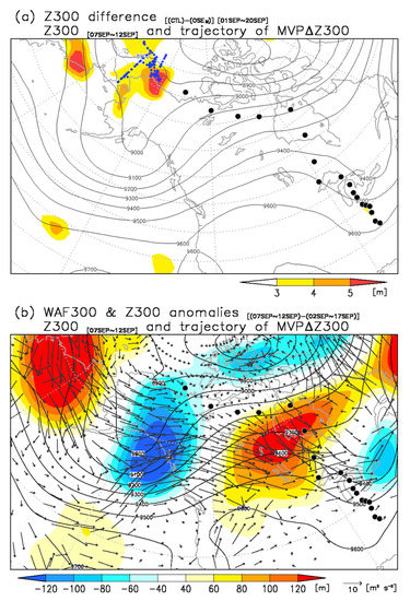 To trace the origin of the large Z300 errors over mid-latitudes, we examined the temporal evolution of the difference between CTLf and OSEMf in Z300 (∆Z300; Figure S3). The parameter ∆Z300 proved useful for assessing the error resulting from the incorporation of additional radiosonde data [18,19]. In addition, this error can be tracked along a route of error propagation, which was computed as follows: (1) ∆Z300 fields were calculated at each forecast time step (Figure S3); (2) a parcel was put at the location of the maximum value point of ∆Z300 (MVP∆Z300) over the western part of hurricane Irma at 0000 UTC 12 September 2017 (forecast day 4.5; Figure 4e; square in Figure S3f); (3) going back in time with a time step of 6 h, the location of the MVPZ300 that was closest to the location of the MVPZ300 of the previous time step was identified (squares in Figure S3a–f) and a backward trajectory of MVP∆Z300 was compiled (Figure S3). The trajectory shows a large ∆Z300 over the Beaufort Sea at the beginning of the forecast period, which moves along the trough to northern Canada and amplifies with lead time, reaching western parts of the hurricane at 0000 UTC on 12 September 2017 (black dots; Figure 6a and Figure S3).