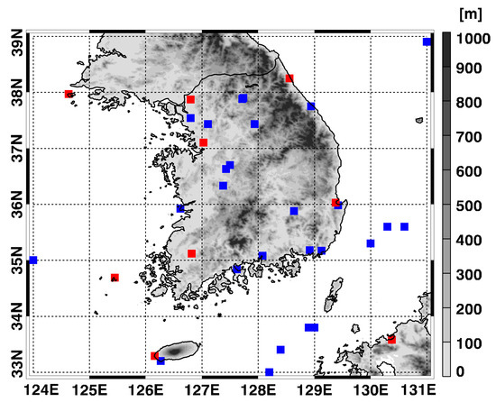 Location of radiosonde stations over Korea (gray contours represent topography and the red squares indicate stations from which over 1000 soundings were conducted).