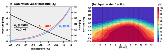 (a) Saturation vapor pressures over liquid and ice (esl and esi). (b) Monthly climatology for Table 1. RHL was applied for temperatures ≥ 0 °C (Equation (2)), whereas RHI was used for temperatures < −23 °C (Equation (3)). For temperatures between −23 °C and 0 °C, Equation (4) was used to estimate relative humidity.