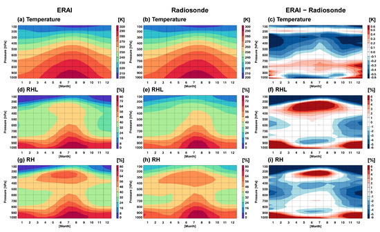 Monthly climatology profiles of (a,b) temperature, (d,e) relative humidity with respect to liquid (RHL), and (g,h) relative humidity with respect to ice (RHI) based on ERAI (left) and radiosonde (middle) datasets. The differences between ERA-Interim (ERAI) and radiosonde data are given in the right panel (c,f,i). The X-axis denotes each month from January to December.
