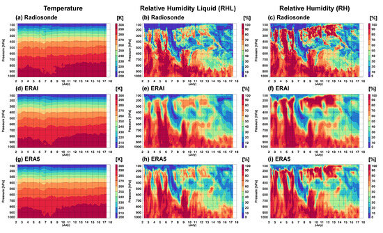 Time series of profiles of temperature (left), relative humidity with respect to liquid (middle), and relative humidity (right) based on (a–c) radiosonde, (d–f) ERAI, and (g–i) ECMWF Reanalysis 5 (ERA5) datasets at the Boseong station in July 2018.