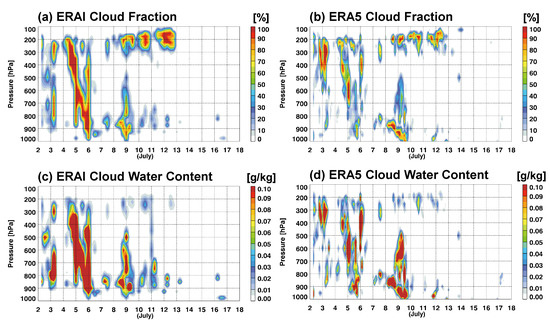 Time series of profiles of cloud fraction and cloud (liquid + ice) water content (bottom) for ERAI and ERA5 datasets at the Boseong station in July 2018: (a) Cloud fraction for ERAI dataset; (b) cloud fraction for ERA5 dataset; (c) cloud water content for ERAI dataset; (d) cloud water content for ERA5 dataset.