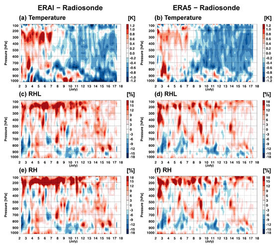 The ERAI- and ERA5-based RHLs displayed temporal and vertical changes (Figure 4e,h) similar to those found in observations. However, the relative humidity distribution reveals new results that were overlooked in the RHL distribution. When the peak height corresponding to a relative humidity greater than 90% was considered the cloud top, between 3 and 6 July, the cloud-top height in the RHL results was estimated at approximately 400 hPa. However, a deep convection reaching 200 hPa was observed in the relative humidity results, as shown in Figure 4c and Figure 5. Similar features were also identified in the ERAI and ERA5 relative humidity results (Figure 4f,i). Throughout the analysis period, the temperatures of −40 and 0 °C, which corresponded to 250 and 500 hPa, respectively, remained almost uniform (Figure 4a,d,g). Therefore, the new relative humidity obtained in this study for 250–500 hPa was a more realistic representation of the cloud-top heights, compared to those based on the conventional RHL method.